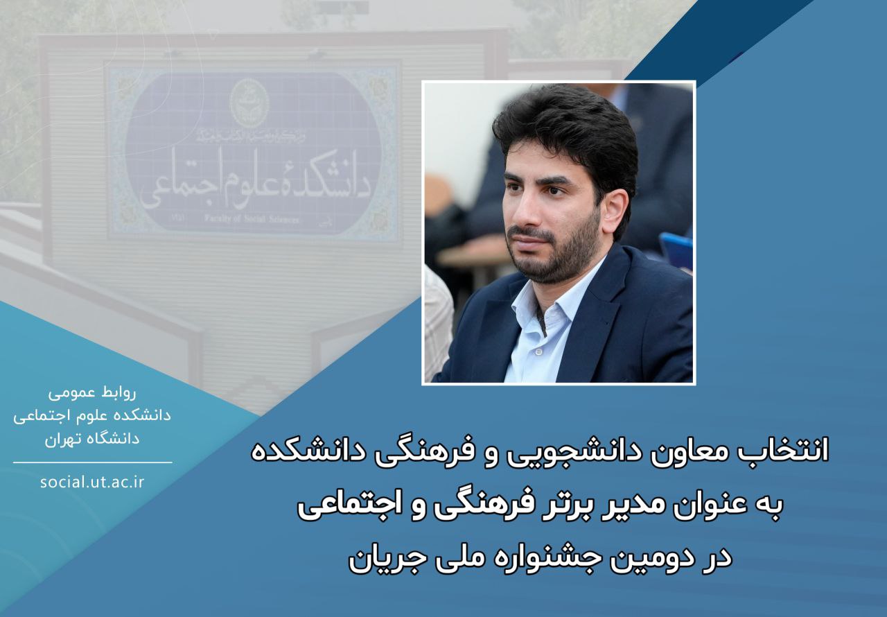 در جشنواره ملی جریان، دکتر سیدپویا رسولی نژاد معاون دانشجویی و فرهنگی دانشکده علوم اجتماعی دانشگاه تهران به عنوان مدیر برتر فرهنگی و اجتماعی معرفی گردید.